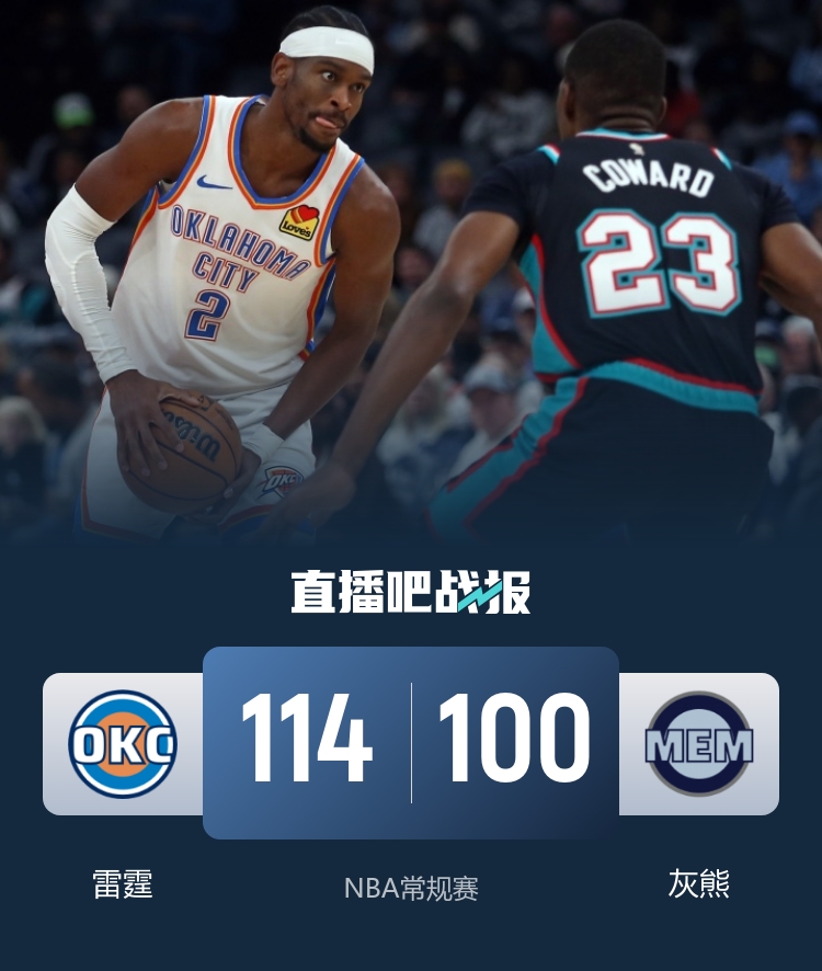 雷霆(10-1):亚历山大35分7板6助2断、霍姆格伦21分7板2助、米切尔21分6板4助3断、哈尔滕施泰因18分13板2助、乔8分2板、华莱士6分4板1助2断、卡鲁索5分4板2助、巴恩海泽4板1助、杰林•威廉姆斯3板1助、吉昂1板
