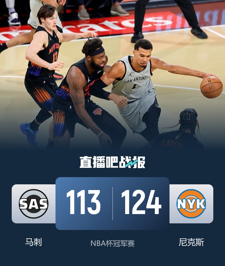 首节之争尼克斯这边主攻布伦森和阿奴诺比,两人包揽球队首节28分里的19分,马刺则多点开花,他们首节9人轮换7人得分入账并在首节的拉锯战中拿到2分领先;次节马刺虽然优势不大但一路保持着领先,尼克斯依旧是阿奴诺比和布伦森为主的进攻抢分,马刺则是多点开花6人拿到6+得分并带着2分领先进入下半场。休息归来马刺在僵持战中依靠文班亚马独砍12分的表现确保领先优势;不过末节克拉克森成为奇兵连续轰进三分带领球队送出15-3的攻势直接扭转局势,最后时刻尼克斯连续命中三分顶住压力守住胜利。最终,尼克斯力克马刺捧起2025年NBA杯冠军。
