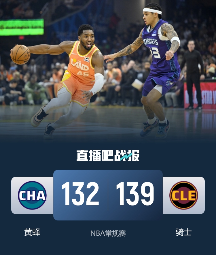 比赛上来,三球就迅速进入状态连中三记三分球,而骑士这边也不甘示弱,双枪联手命中四记远投给出回应,就在骑士要拉开分差的时候他们却突然断电,黄蜂一波9-0抹平分差,凭借着米切尔的半场压哨三分,骑士在半场结束时领先7分;下半场回来,骑士迅速拉开分差到两位数,黄蜂虽然顽强追平但在节末又被对手压制,末节骑士没有再给对手任何机会,分差一直保持在十分以上,最终骑士轻取黄蜂止住三连败。